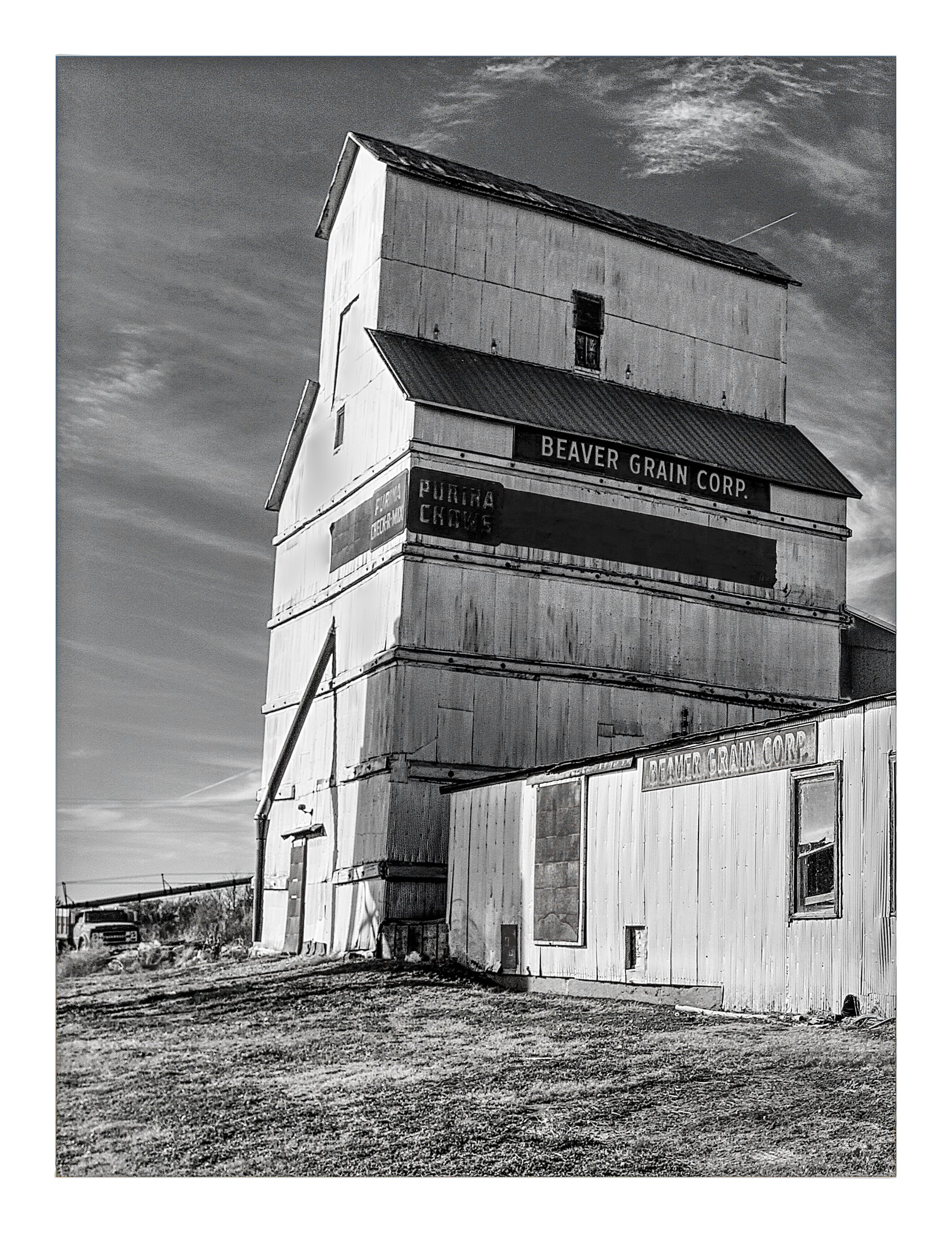 Black & White Photograph of the elevator in Beaver, KS. 17" Wide X 22" Tall on 10.2 mil photo luster paper, glossy.
