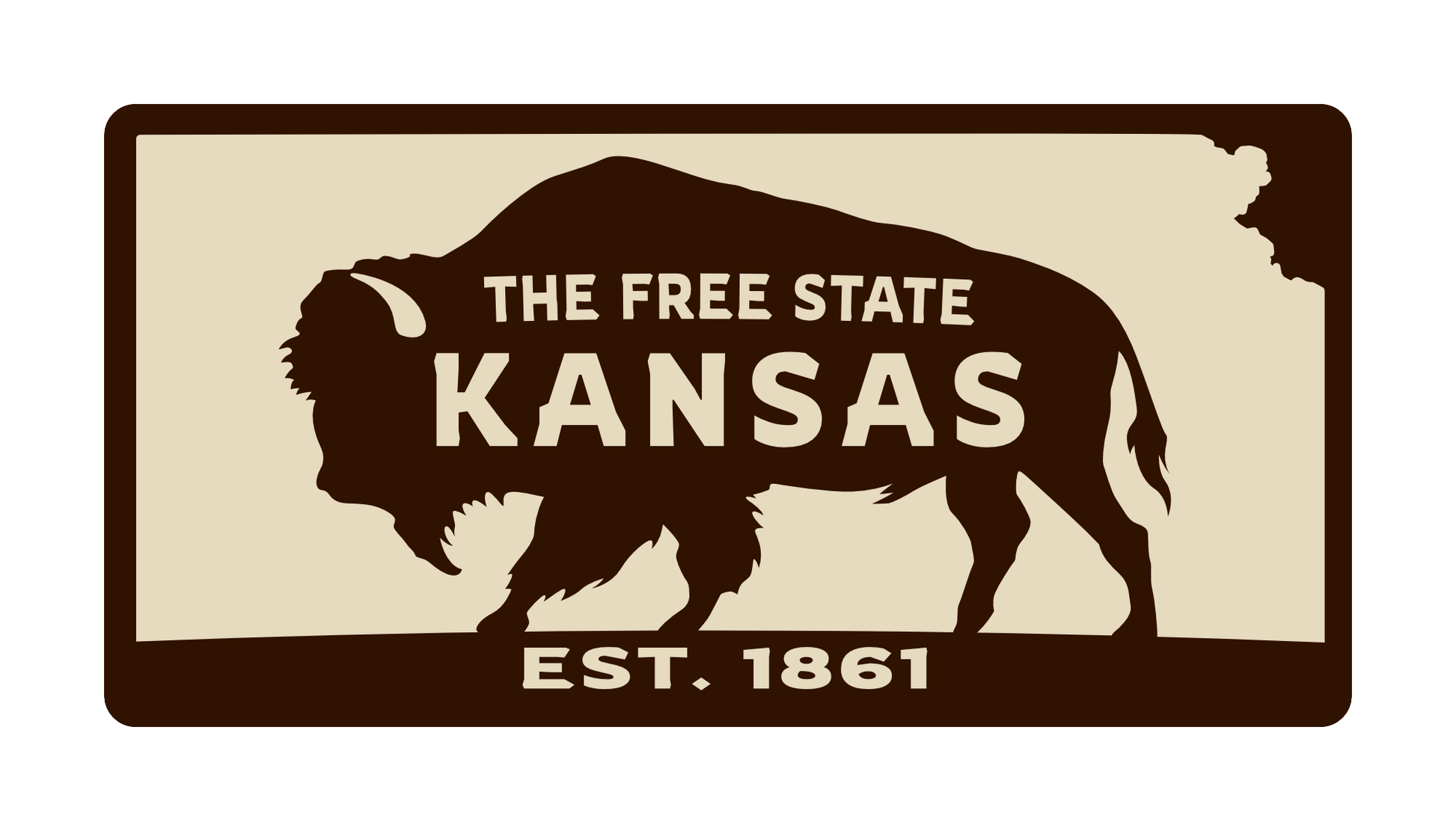 An embossed front license plate featuring the Kansas Free State Buffalo surrounded by the state of Kansas outline.