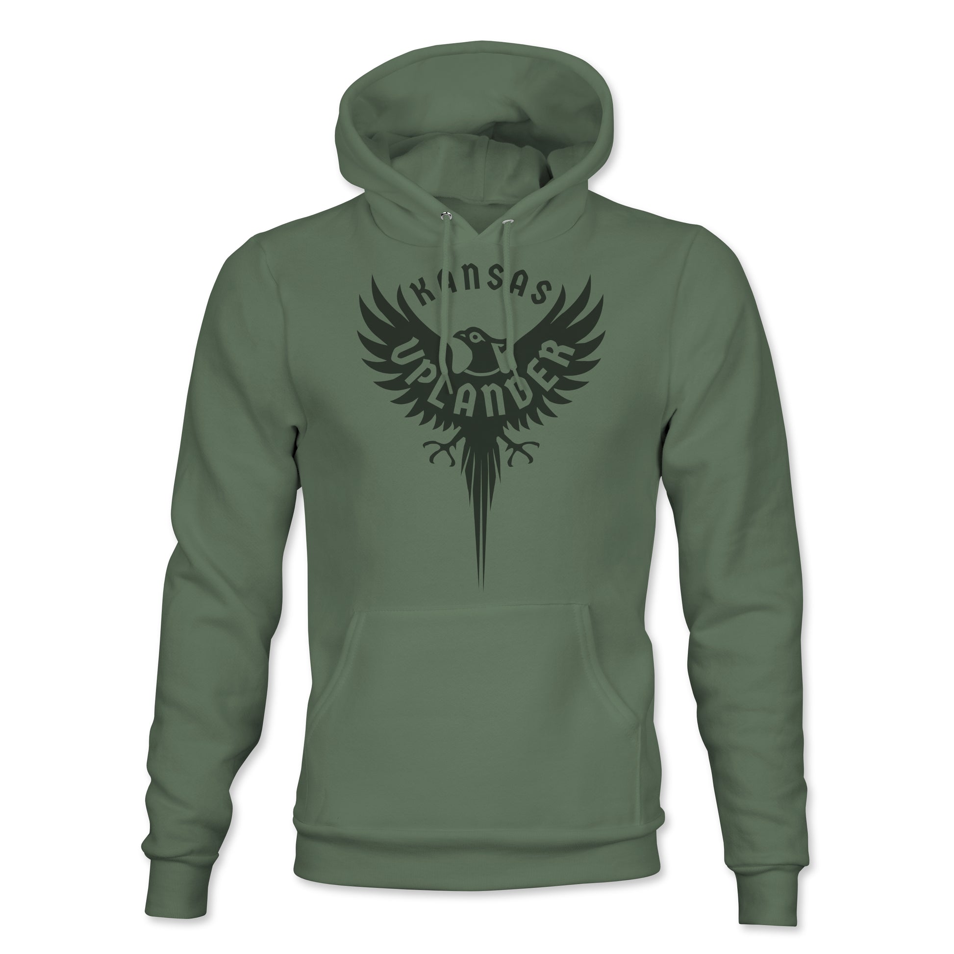 Olive Green Hoodie featuring the Kansas Uplander Rooster logo on front.